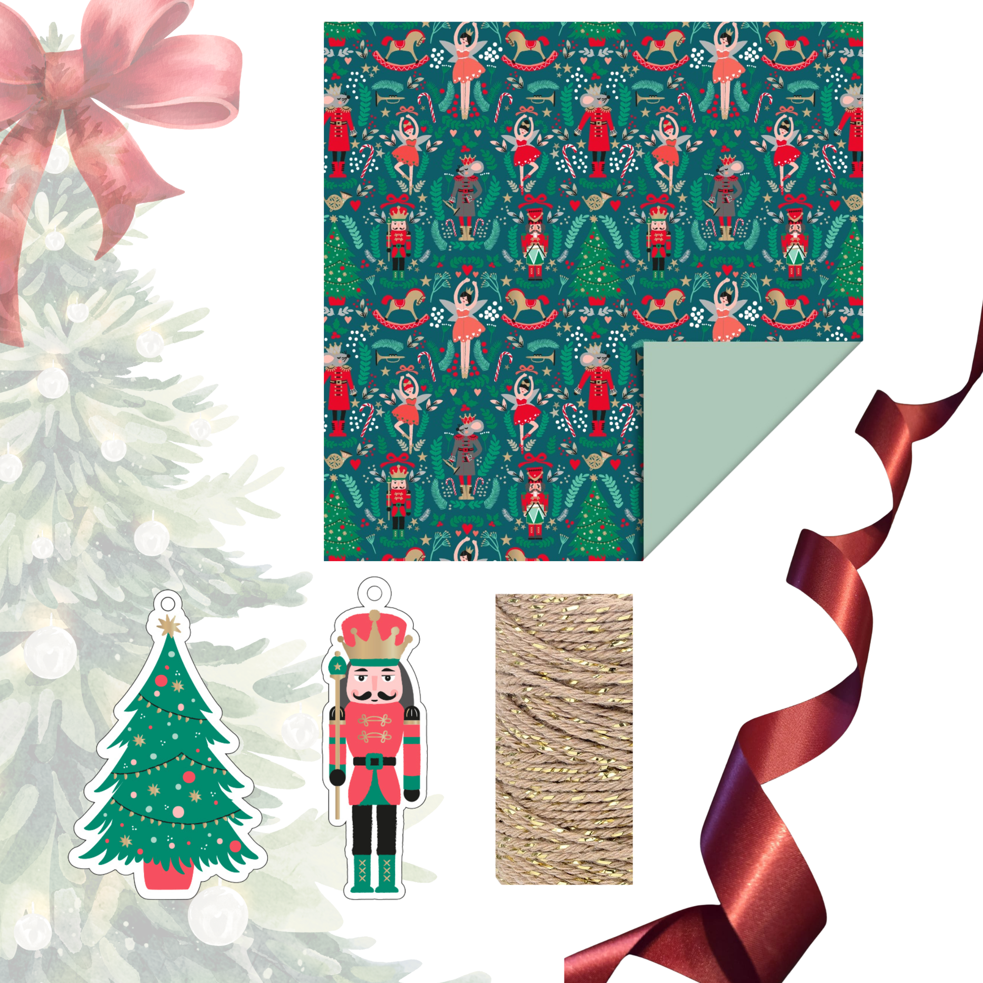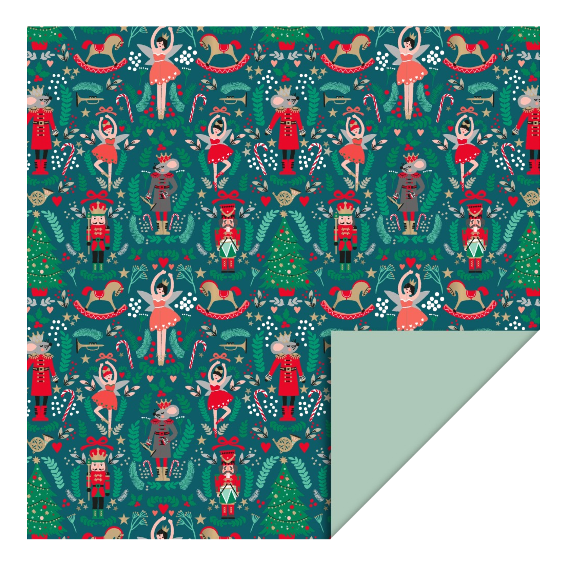 ✨ 1 rol inpakpapier (70 cm x 3 meter) met een vrolijke notenkraker en zijn vriendjes print aan de ene kant en een rustige winterse lichtgroene kleur aan de andere kant.